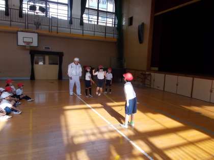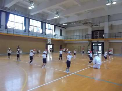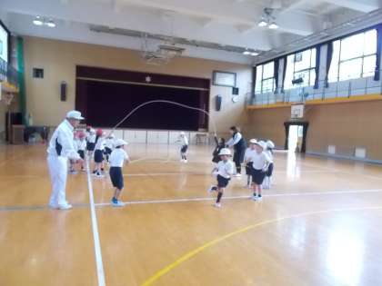 長なわでは、回すときは大きく回してひざを使うこと、なわに入るタイミングを教わりました。グループでの練習では、「ハイ」と声をかけて入るタイミングを教えてあげる姿があちらこちらで見られました。