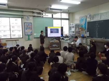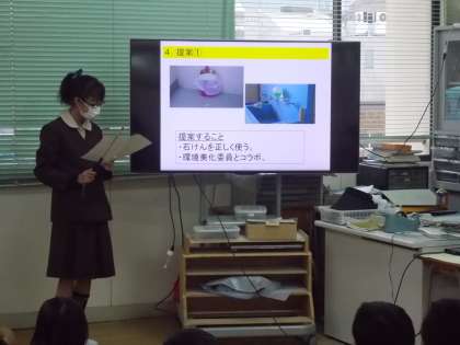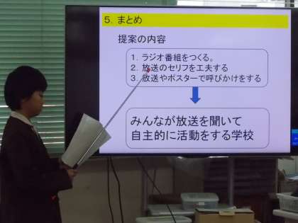 「学校の幸福論」というテーマで各委員会に分かれてプレゼンテーションを行いました。委員会ごとに、学校の現状から課題を取り上げ、それを解決するための提案をしました。どの委員会もタブレット端末をつかいこなし、立派に発表することができました。