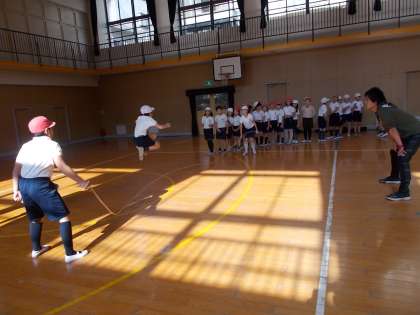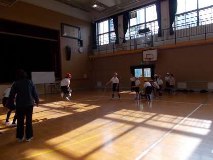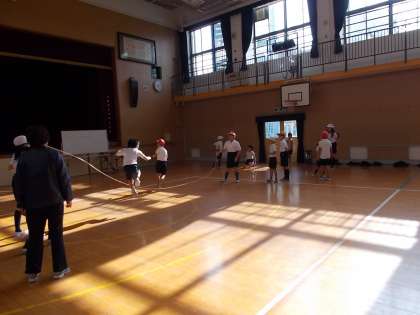 長なわで8の字とびをしました。なわに入るタイミングを意識して取り組みました。なわに入りやすいように合図をしたり、とぶ位置を教えたりと、協力して取り組むことができていました。この時間だけでもとても上手になりました。2月7日(木)に行われる長なわ大会にむけて練習を続けていきます。