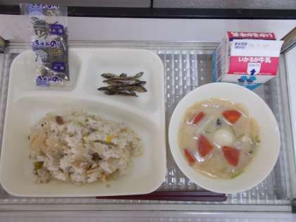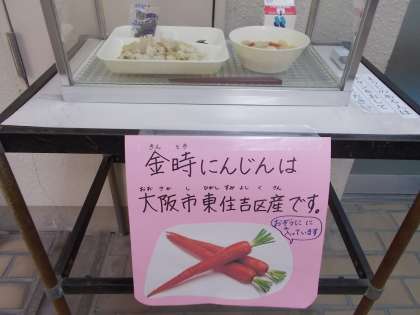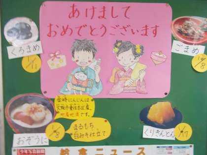 3学期の給食が始まりました。今日の給食はお正月の行事献立で「れんこんのちらしずし、ぞうに、ごまめ、ぎゅうにゅう」でした。ぞうには、地方によって味やおもちの形が異なるようですが、給食では白みそ、丸もちを使用しています。また、ぞうにに使われている金時にんじんは東住吉区で作られたものです。今後の給食に「くろまめ」や「くりきんとん」など、お正月にちなんだ献立が登場します。