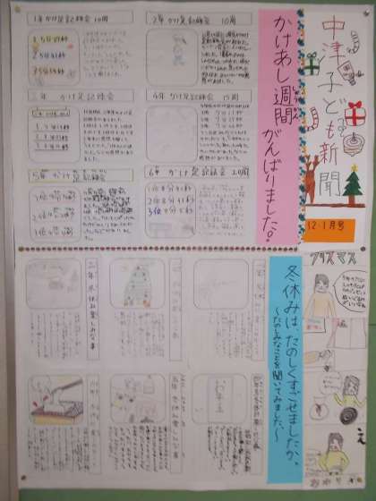 中津子ども新聞の最新号が発行されました。12月の行事からは「かけ足記録会」について、「冬休み楽しみなこと」についての記事が掲載されています。職員室前に掲示していますのでぜひご覧ください。