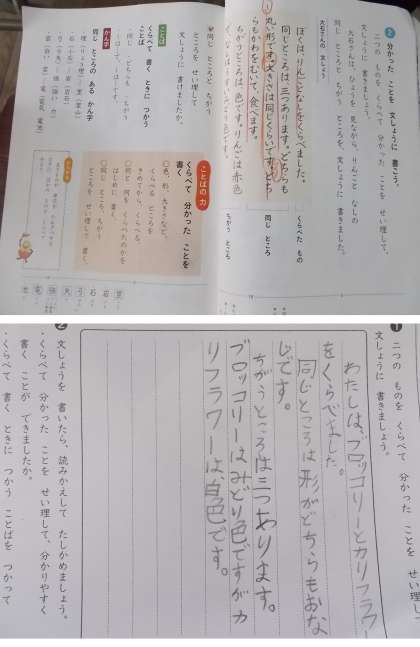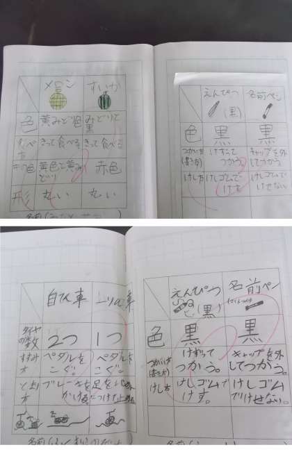 「おなじところ ちがうところ」の学習で、身の回りから似ている二つのものを選び、どんなところが同じでどんなところが違うのか表にまとめ、文章に表しています。何と何をを比べるのか、どこが同じでどこが違うのか、各自考えながら学習を進めています。