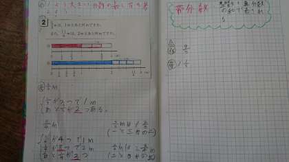 分数の表し方の学習をしています。仮分数を帯分数に、帯分数を仮分数になおす方法を考えました。今後は、分数の大きさ、分数のたし算とひき算の学習をします。