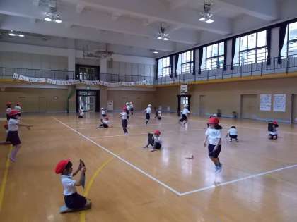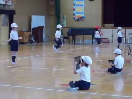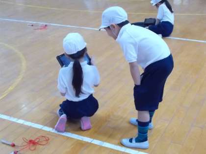 なわとびでいろいろな跳び方にチャレンジしました。ペアでなわとびをしているところをタブレット端末で撮影しあい、よくできているところと、気をつけるところを話し合いました。その後、話し合ったことをいかしてもう1度跳びました。