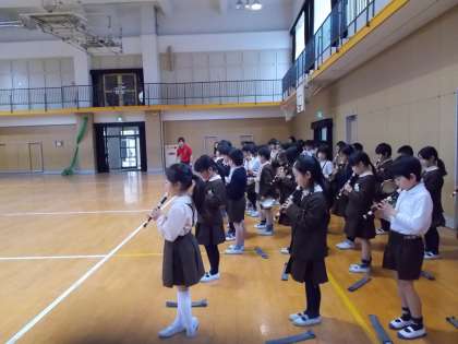 3月6日(水)の卒業を祝う会にむけて、各学年で練習が進んでいるようです。本番と同様に、講堂で練習していましたので紹介します。写真は2年生と3年生です。他の学年も教室や音楽室などで練習している声が校舎内に聞こえています。