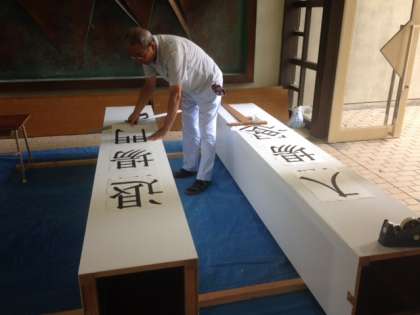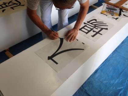 パソコンで明朝体の文字を拡大コピーし、カーボンで写し取っています。