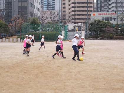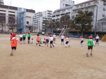 ラインサッカーの学習をしています。足でボールを扱うことに慣れてきたようです。写真はチームごとにゲームをしている様子です。ルールを工夫し、全員が積極的にボールにふれたり、声をかけあって取り組んだりできるようにしています。