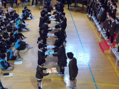 1枚目…6年生から在校生へぞうきんをプレゼント