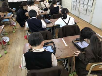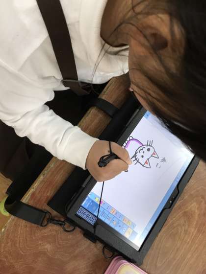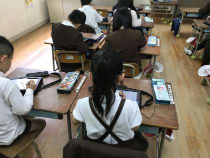 3月からタブレット端末40台が新しくなりました。新しくなったタブレット端末を使っての学習にやる気いっぱいでのぞみました。今日は、「発表ノート」というプレゼンテーションソフト使って、描いた作品や、撮った写真、写真や図に説明を書きこんだことなどについて交流しました。ICT支援員の先生が作ってくださった資料をみながら、意欲的に学習に取り組んでいました。