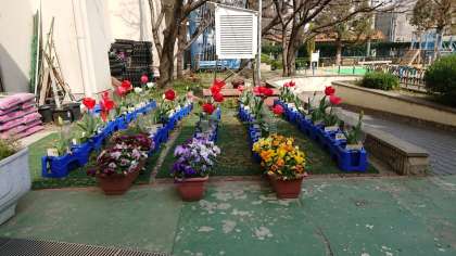 3月末になり、あたたかいと感じることが多くなってきました。校内や地域では春を彩るきれいな植物が見られています。3年生と環境美化委員会が育て出荷したパンジーやビオラが中津地域のいろいろな所で育てられ、きれいに咲いています。すべて写真で紹介できないのが残念です。校内では桜の花少しずつ咲き始め、1年生が育てているチューリップも次々と咲き始めています。入学式、始業式にはきれいな花でいっぱいになっていることを期待しています。