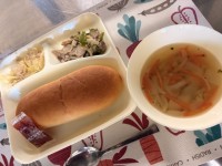 今日の献立は、◯豚肉のガーリック焼き◯スープ◯ツナとキャベツのソテー◯コッペパン...