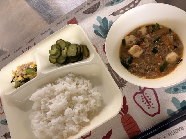 今日の献立は、○ビーフシチュー○ベーコンとさんどまめのソテー○みかん缶○おさ...