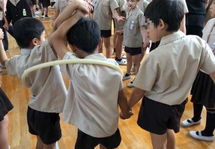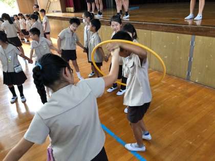 今日の児童集会は、たてわり班で「輪くぐりゲーム」をしました。