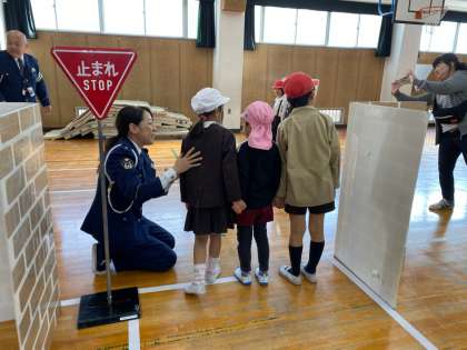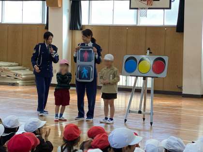 21日の木曜日、幼稚園児のみんなと一緒に、道路の正しい歩き方や、標識の正しい知識を教えて頂きました。