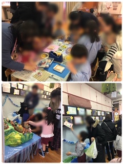 今日は幼稚園の作品展でした。毎日、積み重ねて作った作品や絵をお家の方に見ていただきました。お家の人に自分で頑張ったところを伝えたり、友達の作った作品を一緒に見たりして楽しく過ごしました。お家の人にいっぱい褒めてもらった子どもたちはとても嬉しそうな顔をしていました。
