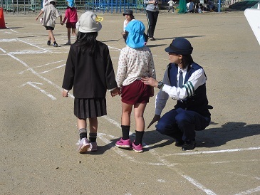 2時間目には1年生と中大淀幼稚園児が標識に関するクイズをしたり、運動場で実際に歩いたりしながら安全な歩き方について学びました。歩く時には、1年生が園児さんの手を優しく引きながら歩きました。