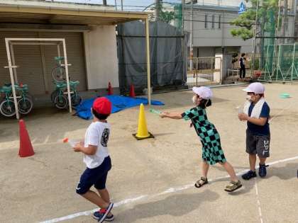 一方、別の遊びグループでは、うちわの骨組みを使ってシャボン玉をしたり、水鉄砲遊びをしたりしました。