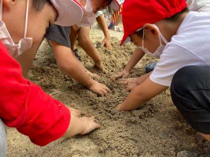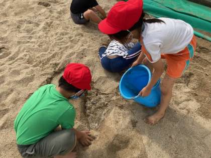 砂場では、穴を掘ったり泥団子を作ったり、水を流して池を作ったりして楽しみました。
