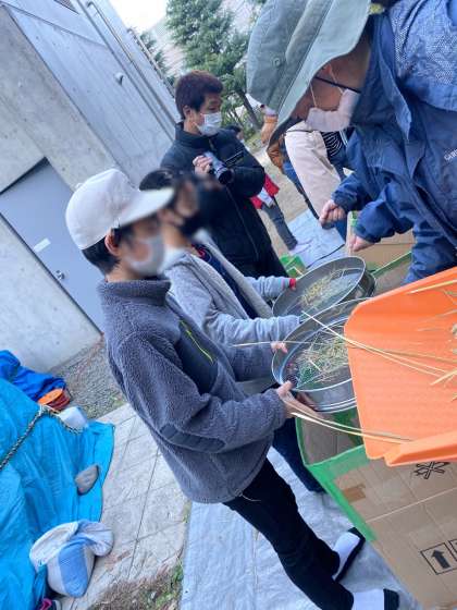 脱穀機や唐箕(とうみ)という機械を使って、玄米になるまでの工程を丁寧に教えて頂き、一人ずつ全ての工程を体験させてもらうことができました。