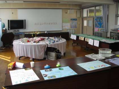 多目的室では、科学、料理、工芸、パソコン・マンガの4つのクラブがこれまでに作った作品や、レシピ等を展示しています。