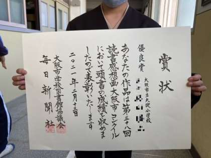 本日の児童朝会で読書感想画大阪市コンクールの表彰がありました。