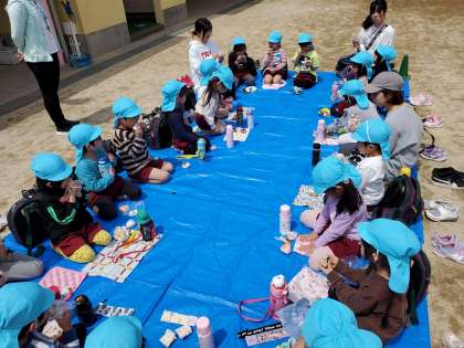 園庭でおにぎりを食べながら、「おいしいね!」と、嬉しそうでした。