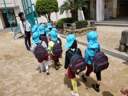 小学校の校庭や幼稚園の周りをお散歩をしながら、木々や花など、興味をもって見ていました。