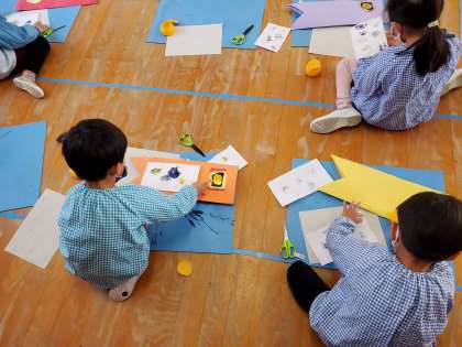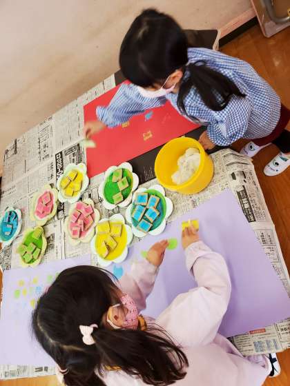 今日は、自分のこいのぼり作りを頑張っていました。うさぎ組は、スタンプを押して模様をつけていました。きりん組は、たたき染めをした紙を貼って、こいのぼりができあがりました!