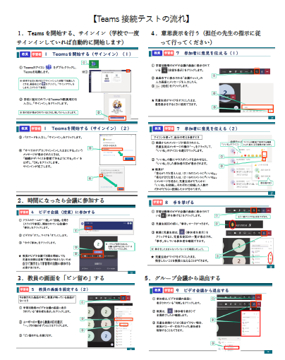 尚、学年のによっては、【Teams接続テストの流れ】に示されている全てのことができない場合もございます。ご了承ください。