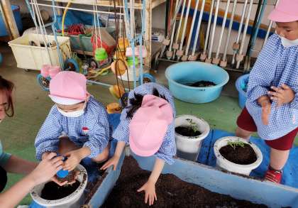 今日は、おうちの人と選んだ夏野菜の苗を先生と一緒に植えました。手で土の感触を味わいながら植木鉢に入れていました。