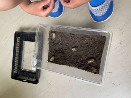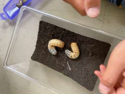 3年生の児童が見せてくれました。コガネムシとカブトムシの幼虫だそうです。生き物を大切にするという素敵な心が育っているように感じました。これからの成長も楽しみですね!