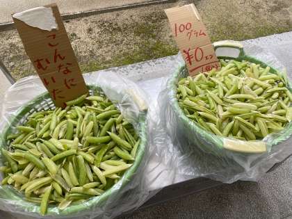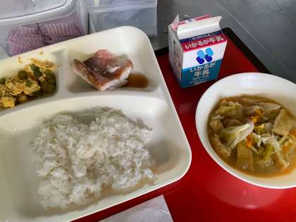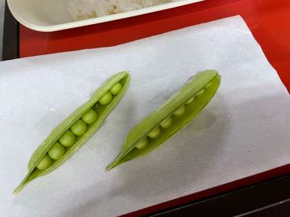 給食室前には、給食調理員さんがむいてくれたえんどう豆の皮が置いてありました。あまりの多さに児童もびっくりしていました。「卵とじ」は個別対応献立です。