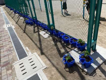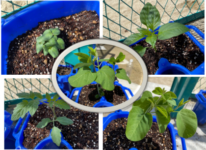 2年生では、いろいろな野菜の苗を植えました。葉っぱを見て、何の野菜かわかりますか?ミニトマト、ピーマン、オクラ、枝豆の4種類を植えました。大切に育てていきたいと思います!