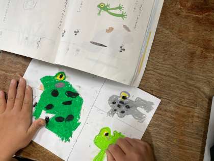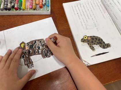 国語科「すいせんのラッパ」で登場するカエルの絵をパスで描きました。図工の学習では、すいせんを絵の具で描く予定です。完成が楽しみです!