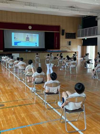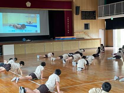 4年生の1時間目は筋トレです!登校している児童は、講堂に集まって間隔をとって、自宅にいる児童はパソコンで動画を見ながらトレーニングです。