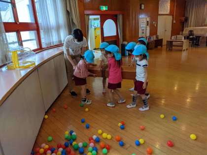 今日はプレイルームで、ボールプールの新しい遊びが始まりました。