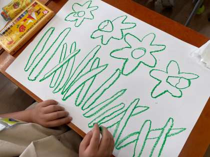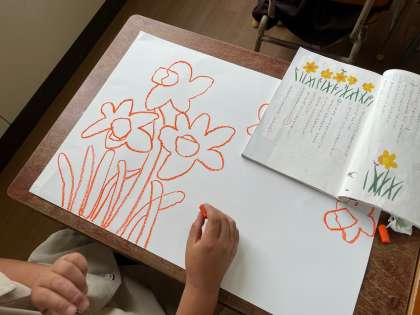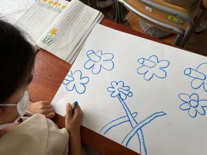 国語科で学習した「すいせんのラッパ」パスで丁寧に描きました。パスをしっかりとにぎり、ゆっくり、大きくを意識しながら描きました。水彩絵の具で色をつけていく予定です。