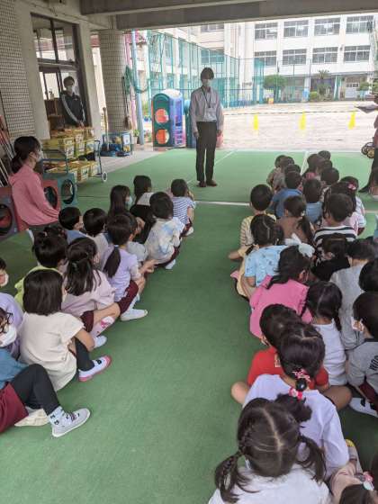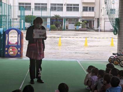 今日は、火災の避難訓練をしました。うさぎ組は初めてだったのできりん組が避難してくる様子を見ていました。きりん組はハンカチで口と鼻をおさえて静かに避難することができました。