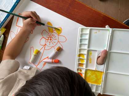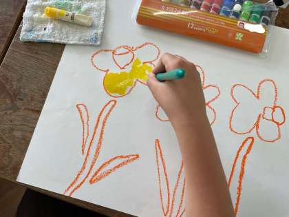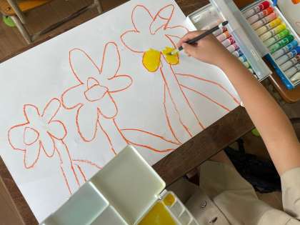 3年生になってからはじめて、絵の具に取り組みました。「トントン塗り」を意識しながら、丁寧に塗ることができました。2色の絵の具を混ぜながら、自分なりのすいせんのラッパに仕上げるために集中して取り組んでいました!