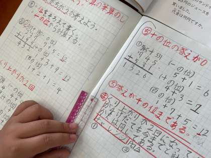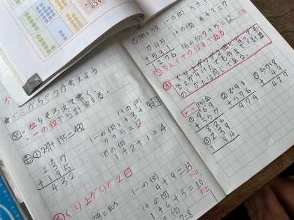 算数科の学習で、3けたのたし算の筆算のしかたを学習しました。「2年生のときに学習したのと同じやな〜」「一の位から計算すればいいね」といった振り返りの声が聞かれました。ノートの取り方もとても上手になってきました!