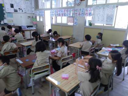 数図ブロック並べ、ふたつに分けたり、裏返して色を変えたりしながら、8は3と5、9は7と2、などひとつずつ確かめます。おはじきや数カード、数図ブロック等を使い、ゲームのように楽しみながら、学習を進めています。