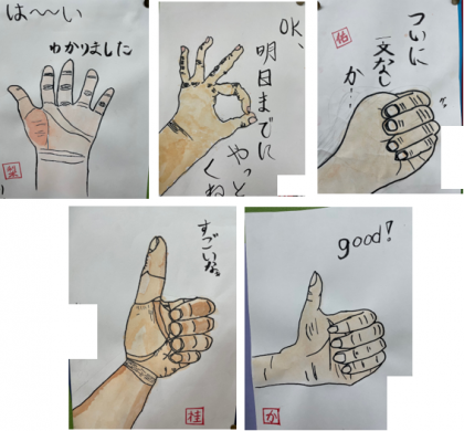 自分の手をよく見て、まずはペンで描写しました。その後、絵の具で丁寧に塗り、自分なりにコメントをつけました。力強い手や繊細な手など、ざまざまな手が描かれていました。