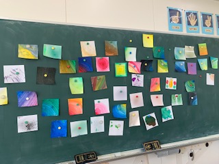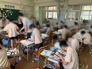 5年生の図工では、『名前でアート』という作品をしています。絵の具で様々な塗り方をしています。完成が楽しみです!