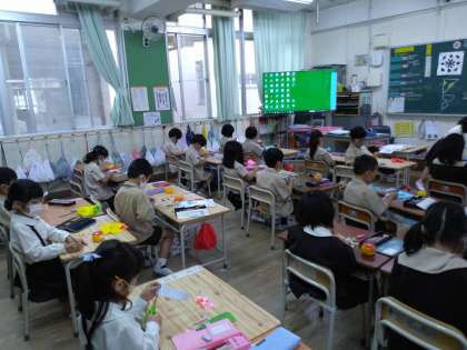 図工の学習で、折り紙を折って、切って、広げて、作品を作りました。