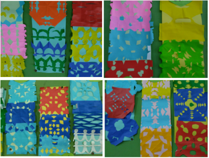 重なった折り紙を切るのは難しいなと話しながら、切り込みを入れたり、切り落としたりして、作品を作りました。