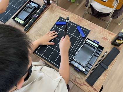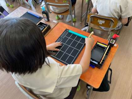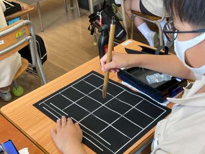初めての習字学習。まずは、道具の名前、置き方、姿勢について学習しました。来週から実際に毛筆をはじめいきます。筆の持ち方を知って、「筆を持つのが大変そう」「早く書いてみたい」などの感想が聞かれました。