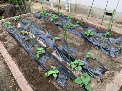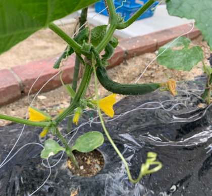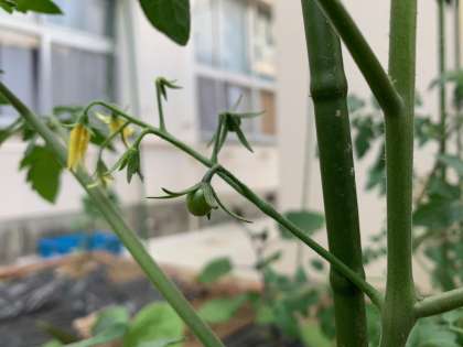 子どもたちが毎日の水やり当番を頑張り、トマトとキュウリが小さい実をつけました!