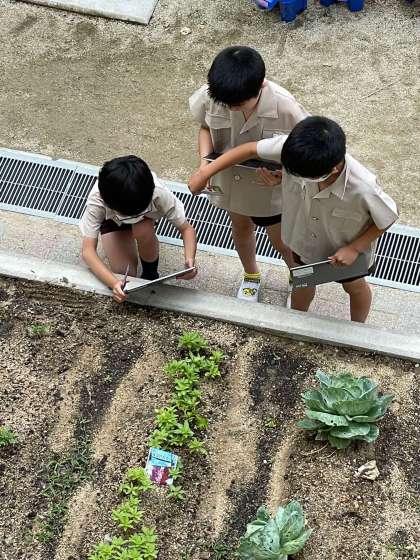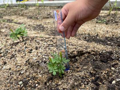 学習園で育てているヒマワリ、マリーゴールド、ホウセンカの観察を行いました。順調に育ってきました。ものさしを使って草たけを測定したり、葉の数を数えたりしました。