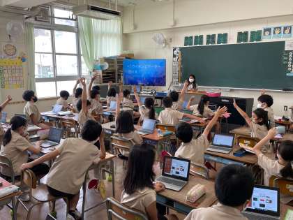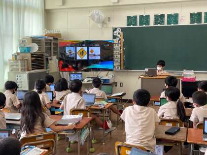 パソコンのパワーポイント機能を使って、子どもたちはいろいろなクイズを作っています。自分で作ったクイズをみんなの前で発表しています。とても楽しそうでした!