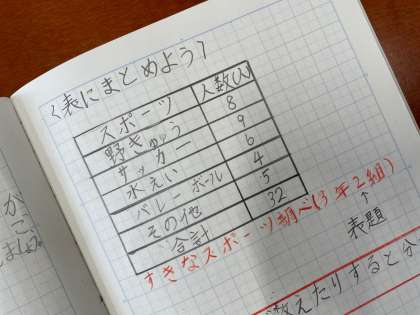 算数科、棒グラフの学習です。今日はアンケート結果をもとに、「正」を使ってそれぞれ何人か数えました。数えたものを表にまとめました。これから、棒グラフについて学習していきます。